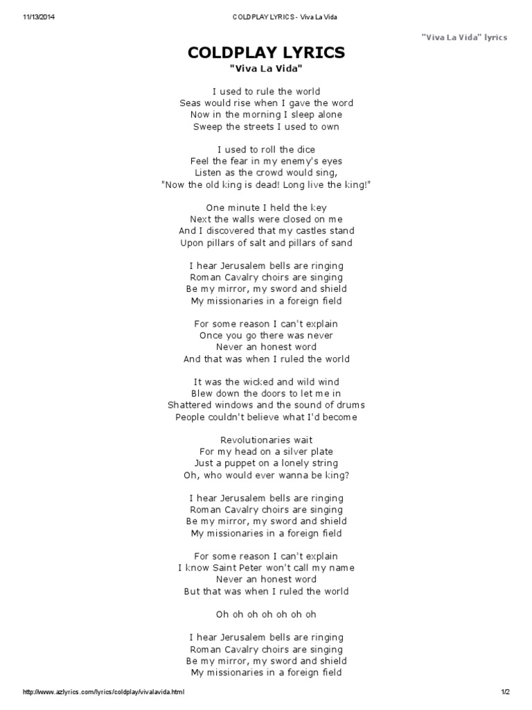 Coldplay Lyrics Viva La Vida Leisure Entertainment General