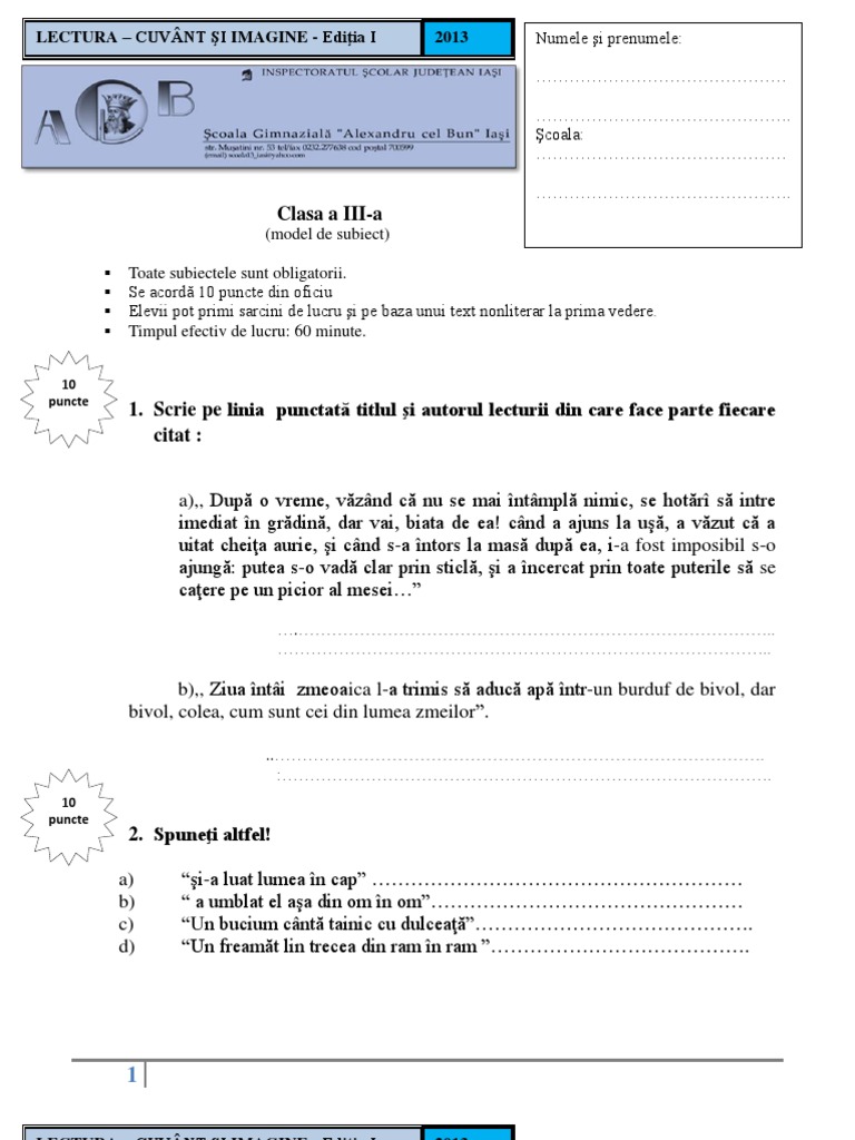 Lectura Subiecte Clasa Iii Varianta I 1 Pdf